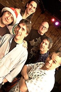 To say that the six-man drum intro was thunderous would be an understatement. Still, the impeccable arrangement gave each member of the En-train a distinctive and distinguishable sound. As the opening onslaught emptied into the crowd favorite “Fresh” (which still was very much so), Major, Tom held the troops together rhythmically and bass giant Ned Nugent barked down at his mic, laying down grooves as smooth and low as he was lumberous and tall, while the rest of the front line participated in a bit of ska-reography between Sam Holmstock’s hatless sax solos, Hilary Noble’s intermittent sax and drums and Klem Kilmek’s sharp ‘bone breaks. Klem’s Italiano squeezebox introd Ned’s vocal lead for a new chugger entitled “Off This Train” which also featured front man Brian Alex’s Latin Strat lines and fret-slicing solos. “Back In A Minute” was a funky tune a la Vineyard neighbor James Taylor. “Mother Street” (from the band’s last album, “Can You Get It”) used a zydeco-ed Bo Diddley hand jive to get the crowd tapping their toes. And when Tom’s solo opened into Alex’s Winter-y guitar re-reentry, the place was as electric as Dr. Frankenstein’s lab. That Tom’s drum set was set upon cases of beer only enhanced the party mood. The bellowy ballad “Nancy” mixed Sinatra-style lyrics with reggae dancehall sway and Carnivale horn stomps. No Entrain set would be complete without “Dancin’ In The Light,” and the boys served it up with full force and fun. How could anyone possibly sleep through this song? It demands dancing, especially in this tongue-twisting up tempo version. Closing out the set was the new album’s closer, “Arm Yourself,” a grumbly call and response featuring Holmstock’s sax. Though the set was not “All One,” the crowd and the band were united in fun.